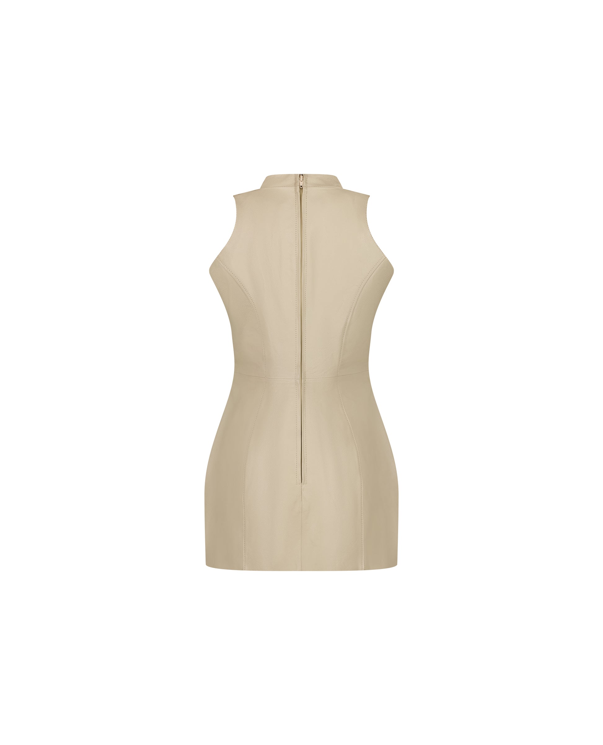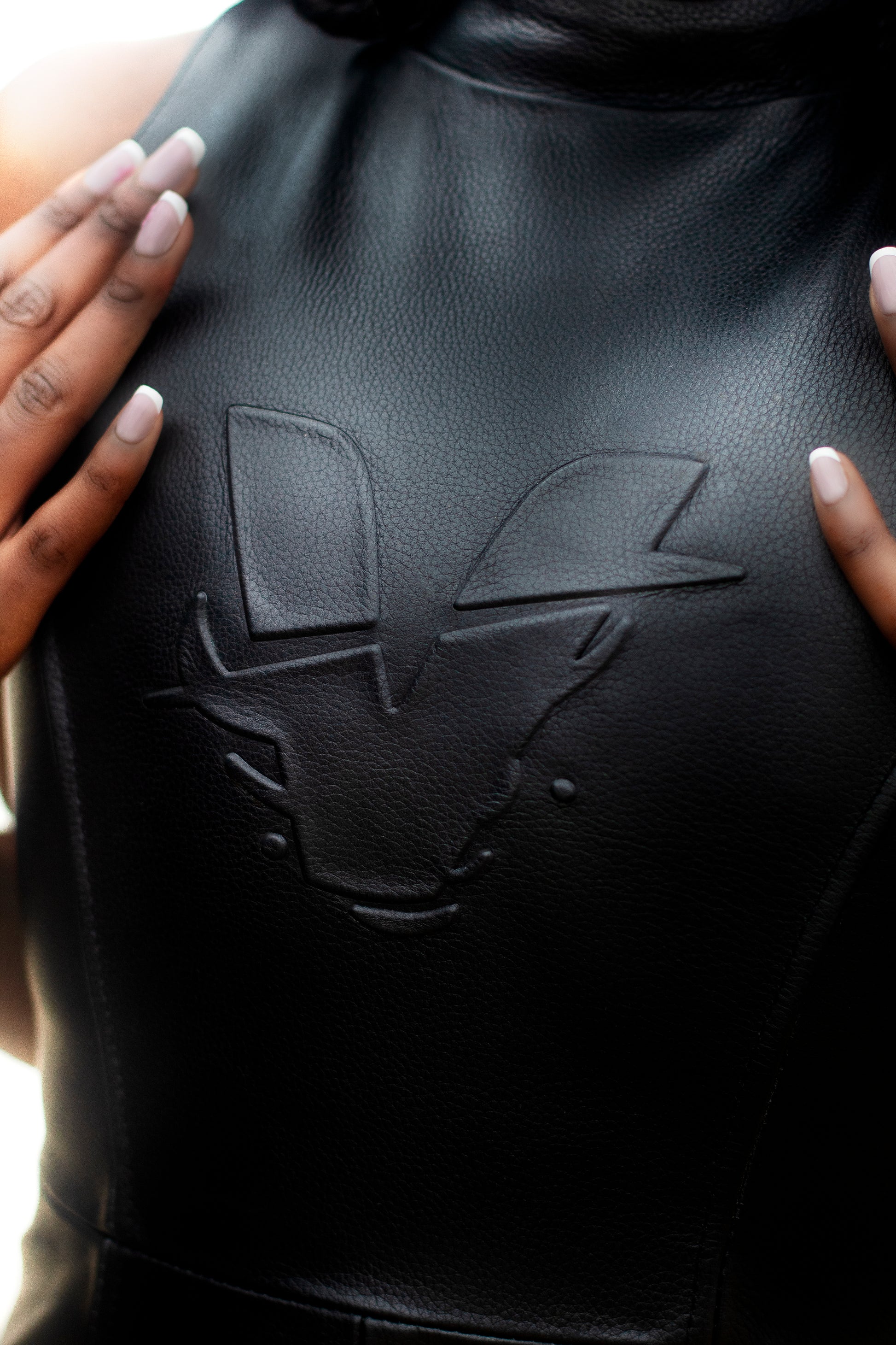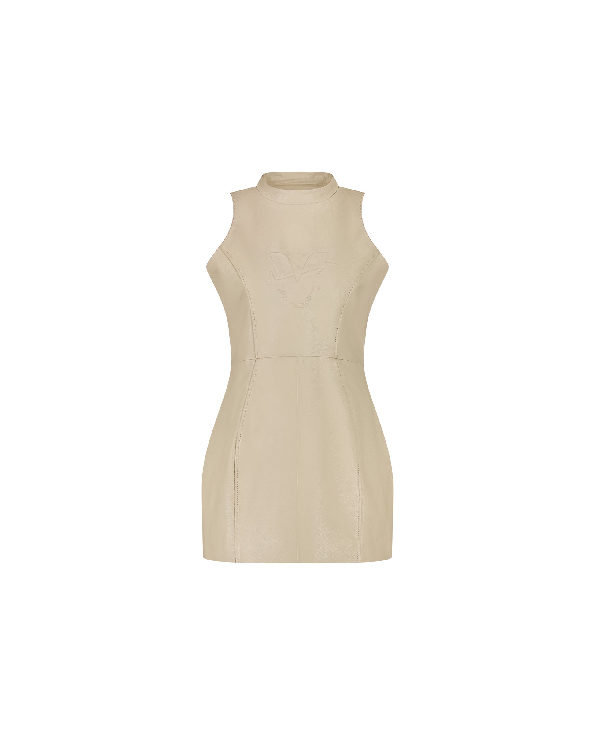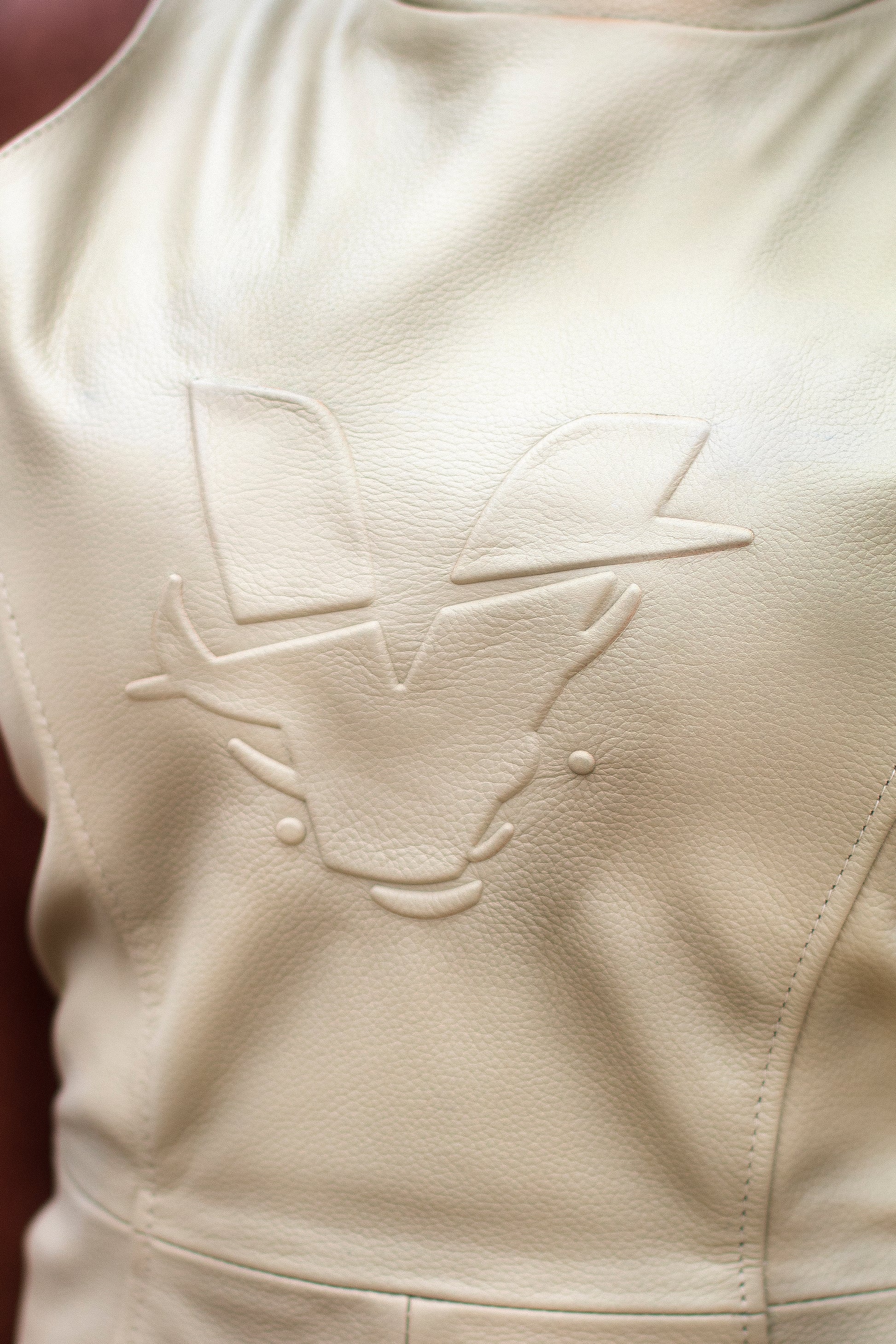 Cette robe courte, élégamment cintrée, est confectionnée en cuir lisse et déclinée en deux coloris. À l’avant, le monogramme VERON subtilement embossé, signature emblématique de la marque affirme son caractère. Le dos se pare d’une fermeture zippée invisible pour une ligne nette et raffinée.