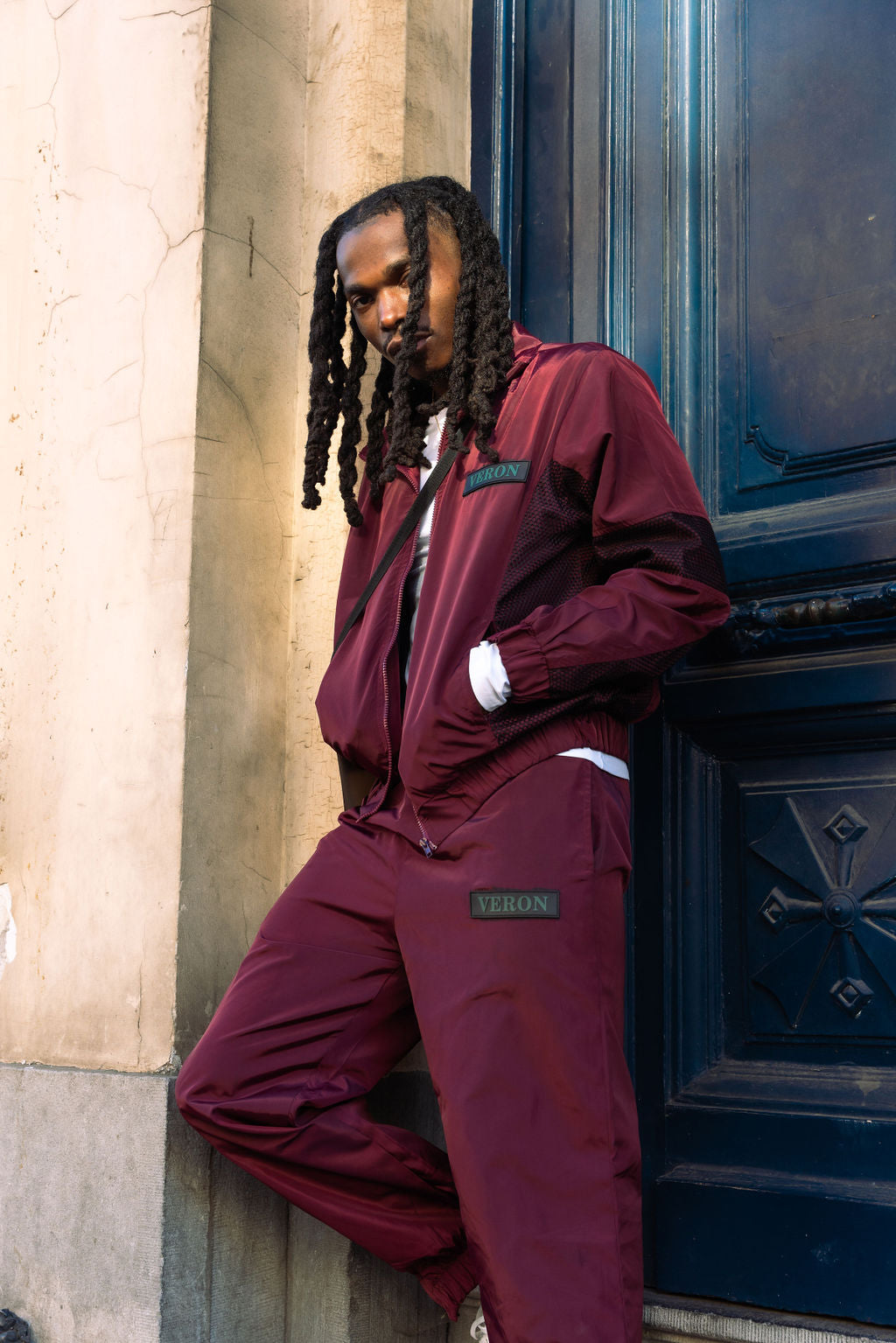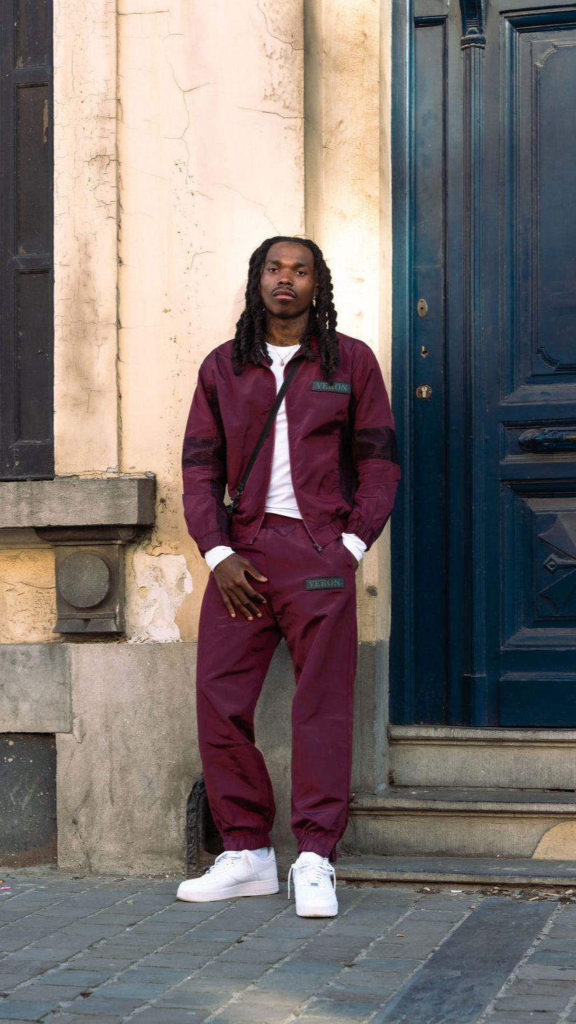 Ensemble survêtement en nylon avec parties en filet contrasté. Col montant. Poches invisibles. Badge en caoutchouc sur la poitrine et sur la jambe gauche. Taille, bas de manches et bas de jambes elastiqués.